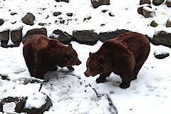 Auf das Baden müssen die beiden aber noch verzichten. Vorsorglich wird über Winter immer ein Teil des Wassers abgelassen. Fred & Frode hatten aber trotzdem ihren Spaß und zerdrückten das Eis, schleckten den Schnee, spielten mit Hölzern, schubberten sich das Fell und zupften etwas Gras.