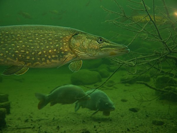Im größten Natur-Aquarium des Nordens leben rund 30 vorwiegend heimische Fischarten. Darunter gibt es Raubfische wie Hechte, Forellen, Barsche, aber auch Friedfische wie Karpfen, Rotfedern, Plötze, Karauschen, Döbel. Ein versunkener Fischerkahn ist Lebensraum für den einen oder anderen Unterwasserbewohner. Der größte Fisch im Wildpark-MV steht auf dem Trockenen. Es ist ein begehbarer Riesenwels aus Edelstahl und bildet den Blickfang eines Infopunktes zu den EU-Wasserrahmenrichtlinien.